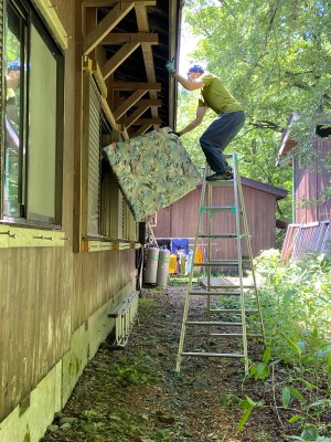 新型コロナウイルス の影響で小屋入りが二ヶ月以上遅れ、梅雨前の布団干しができなかっただけに、この晴れ間を逃してなるものかと一気に屋根に敷き詰めました。