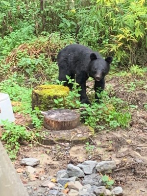 8月8日午後5時、嘉門次小屋の敷地内に小型のクマが現れました。音をたてて追い立てると嫌がって逃げていったのですが、今度は道を悠々と歩いていました。