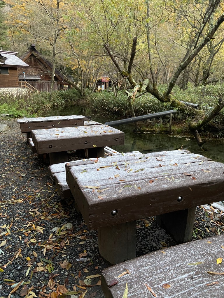 昨夜は雨が降り、嘉門次小屋から見上げる明神岳5峰も白くなっていました。営業終了まで2週間、今年はその後橋の工事があるので、それぞれの町に降りるのはもう少し先です。