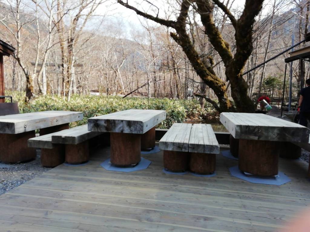 川沿の3組のテーブルと椅子はカウンター式に改め、その他は傷を手当てとサンダーがけをし、鎖が激しかった脚の丸太を全部取り替えました。