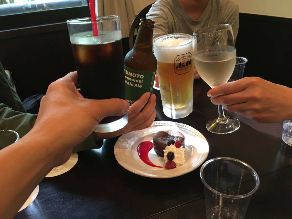 お喋りしながら時間をかけて下山をして、徳沢ロッジのお風呂に入り、ラウンジで乾杯して夕方に戻りました。