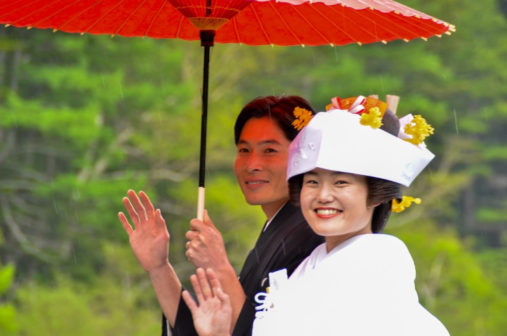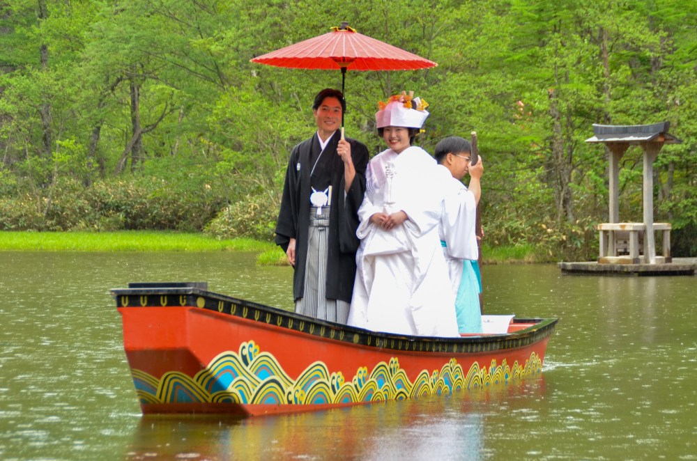 1番の心配は天気でしたが、パラパラと降ることはあっても式に何の支障もなく、神前の儀式のあと、2人は新緑の美しい明神池を舟でめぐりました。